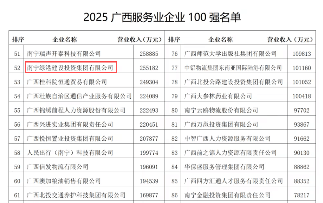 近日,廣西企業(yè)與企業(yè)家聯(lián)合會、廣西工業(yè)經(jīng)濟聯(lián)合會聯(lián)合發(fā)布“2025廣西服務(wù)業(yè)企業(yè)100強”榜單。南寧五象經(jīng)投集團下屬企業(yè)綠港集團憑借穩(wěn)健的綜合實力、突出的發(fā)展成效,第4次榮登該榜單并位列第52位,彰顯了公司在服務(wù)區(qū)域發(fā)展、推動產(chǎn)業(yè)升級中的堅實底氣與強勁動能。